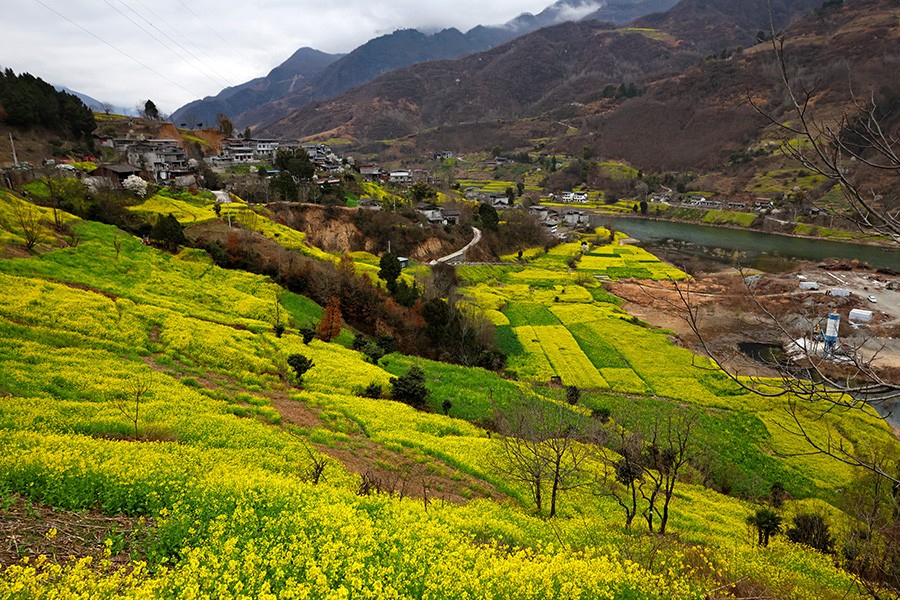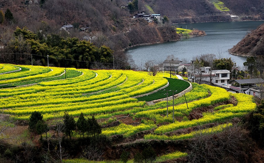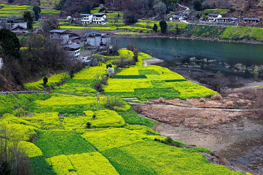 春回大地时节,甘肃文县白龙江、白水江沿岸万亩油菜花竞相绽放。金灿灿的花海与碧水青山相映成趣,白墙黛瓦的村落点缀其间,构成一幅生机勃勃的乡村春景图。